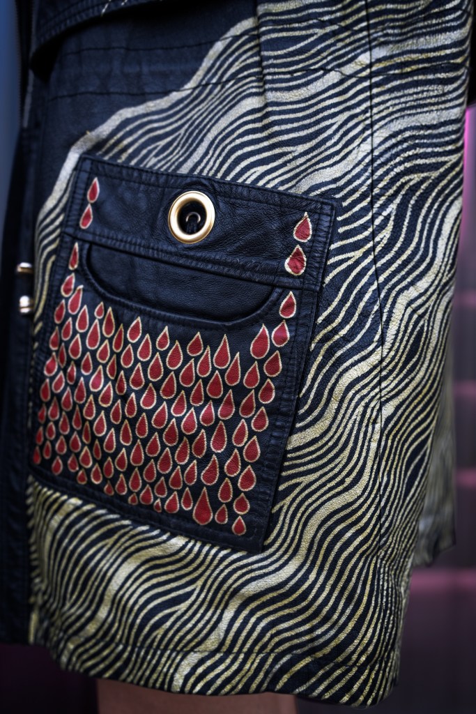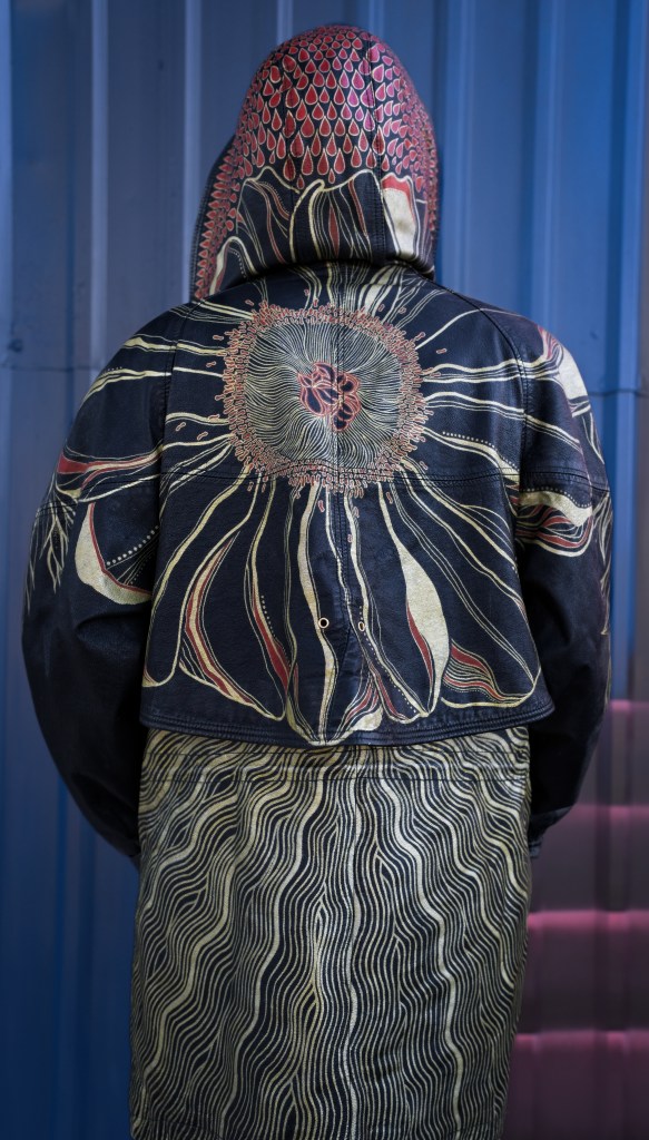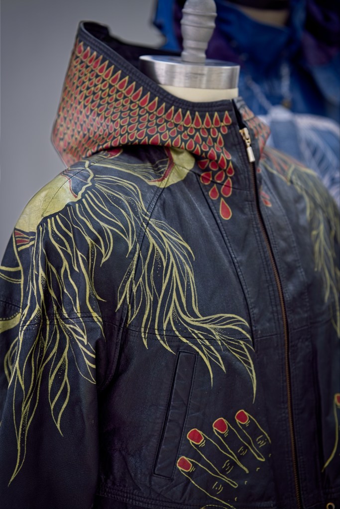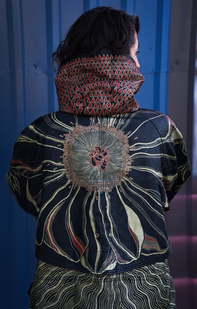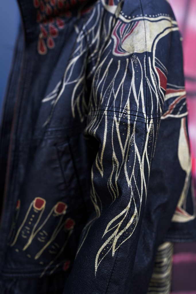 The backside hosts an oversized peony in full bloom, extending onto the hood and shoulders with it’s leaves cascading down the sleeves and front of the jacket. Metallic gold and deep red paint offer a brilliant contrast to the rich black leather canvas. The hand “prints” represent my signature.