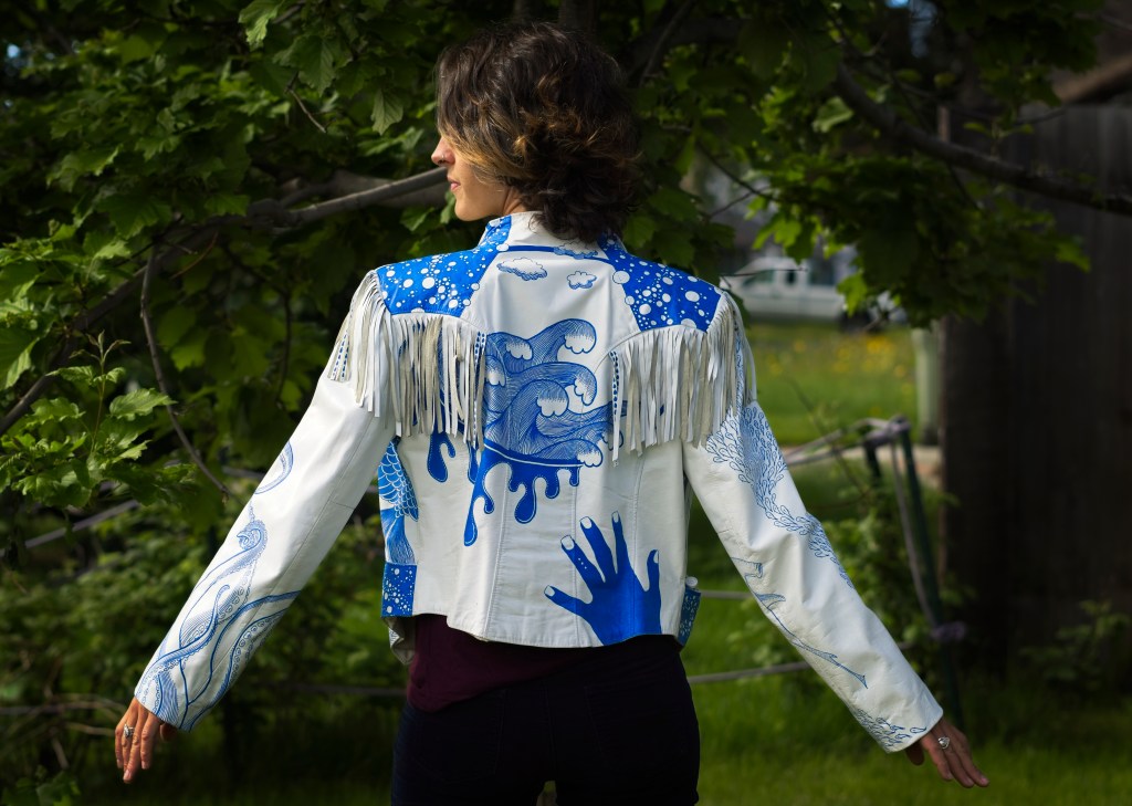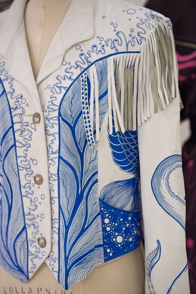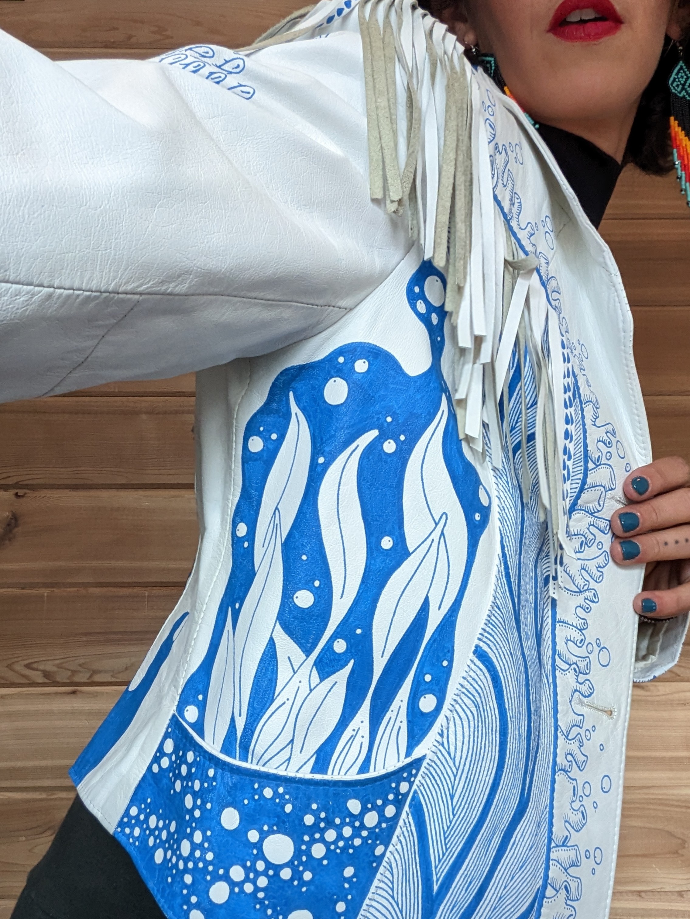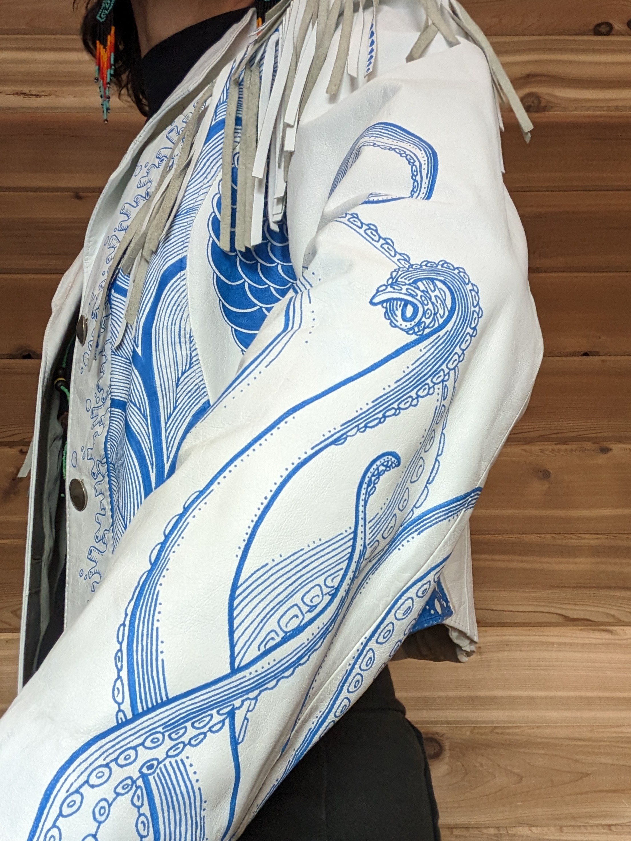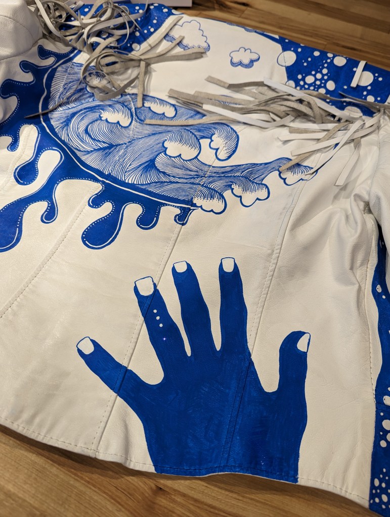 A royal blue monochrome color palate yields the perfect setting for the ocean theme carried throughout this piece, complete with sharks, octopi, waves, and coral. The hand “print” represents my signature.