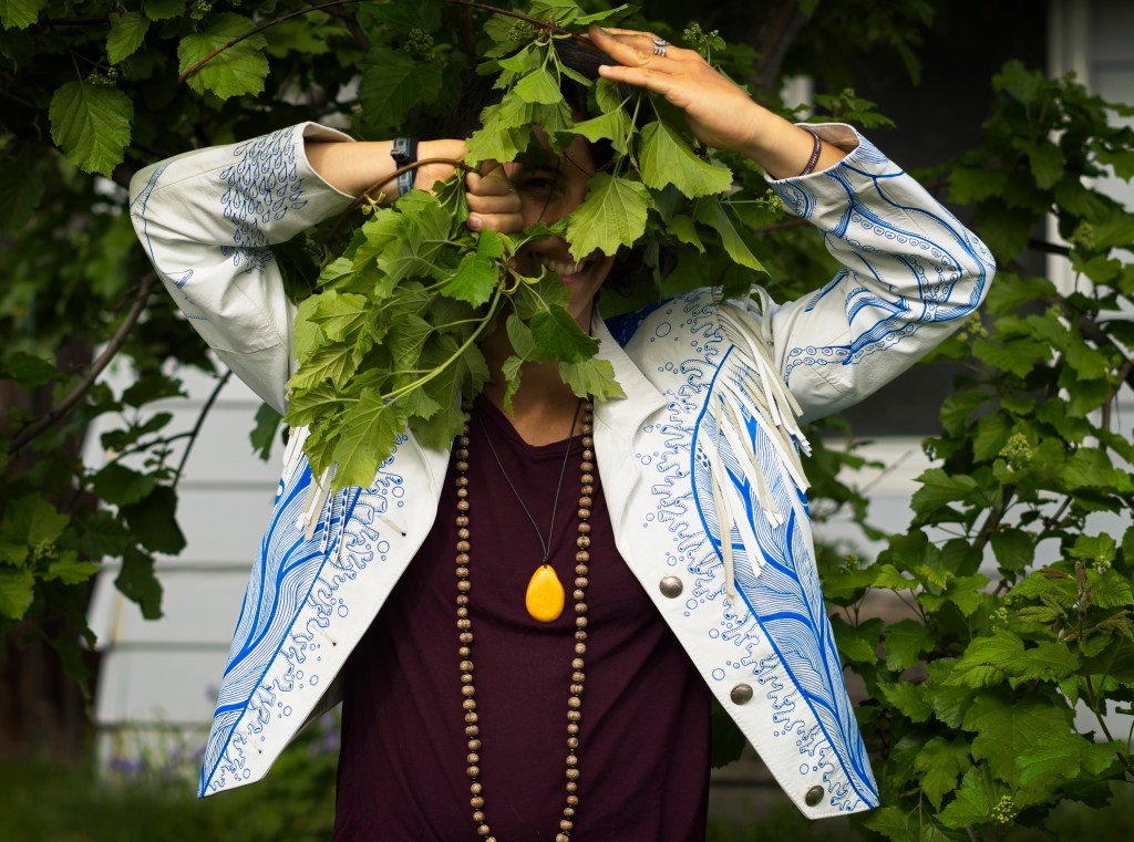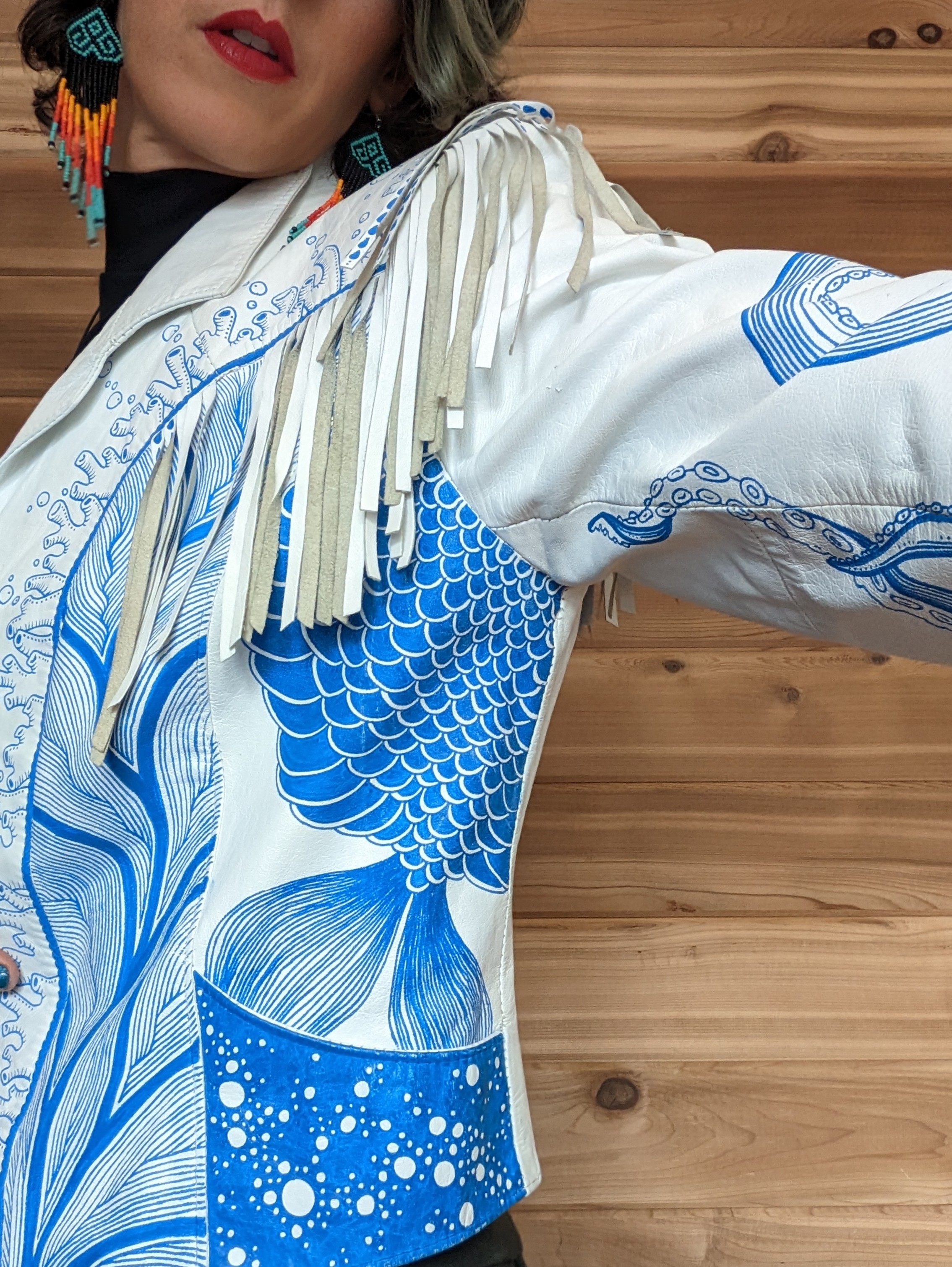 Vintage white leather fringe jacket with silver buffalo button closure. A great western cut with lots of character.