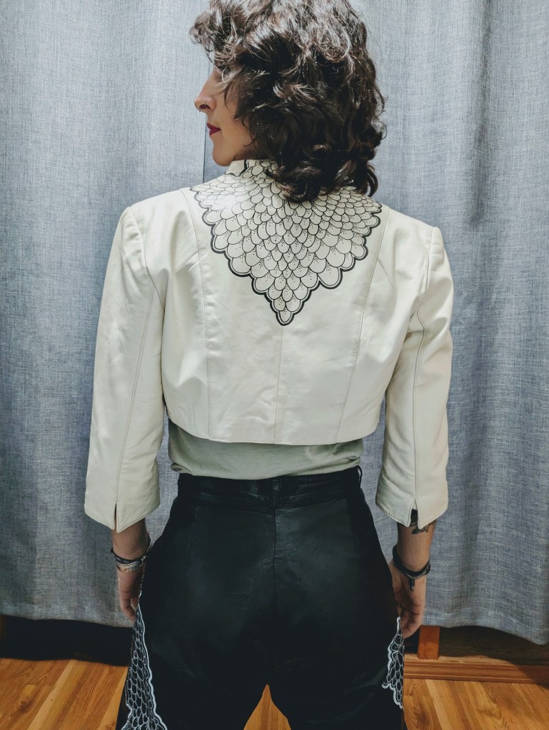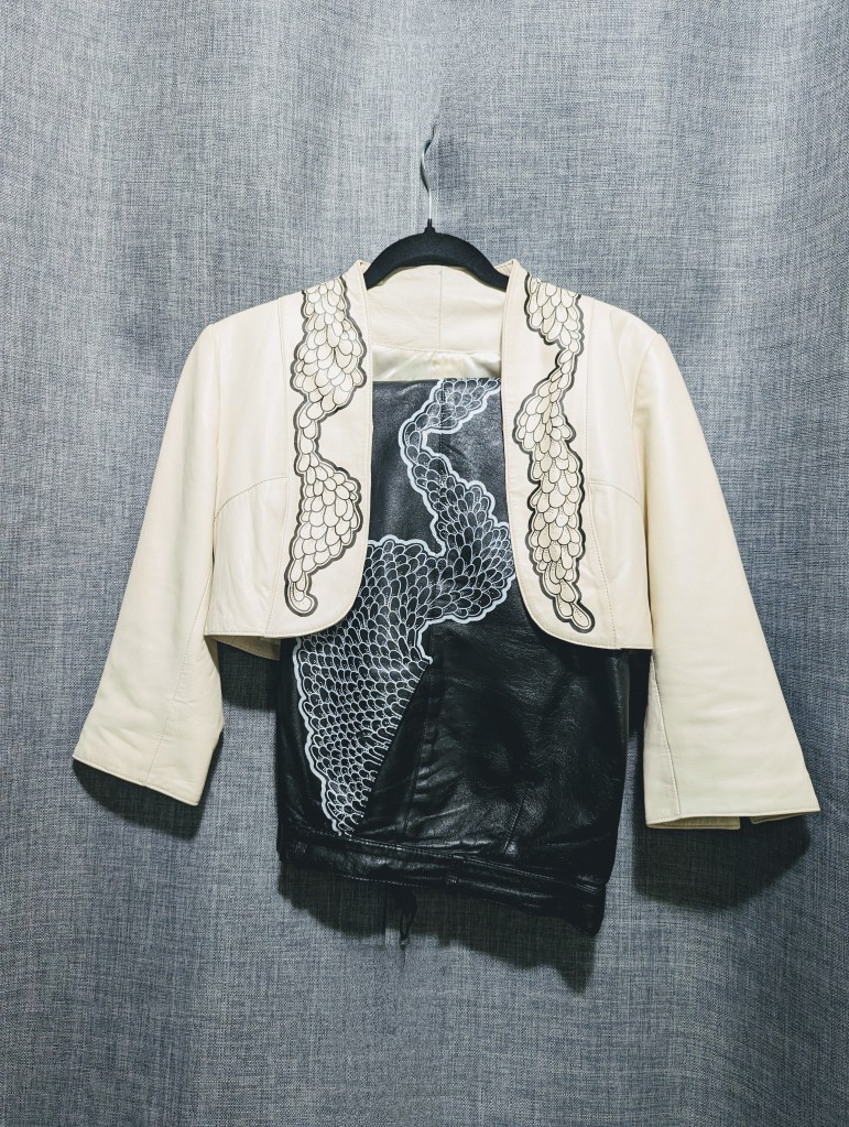 Cream leather bolero jacket and three quarter sleeves.