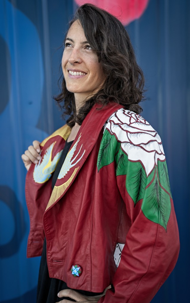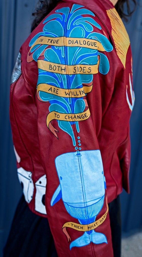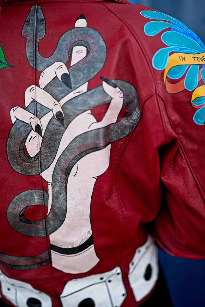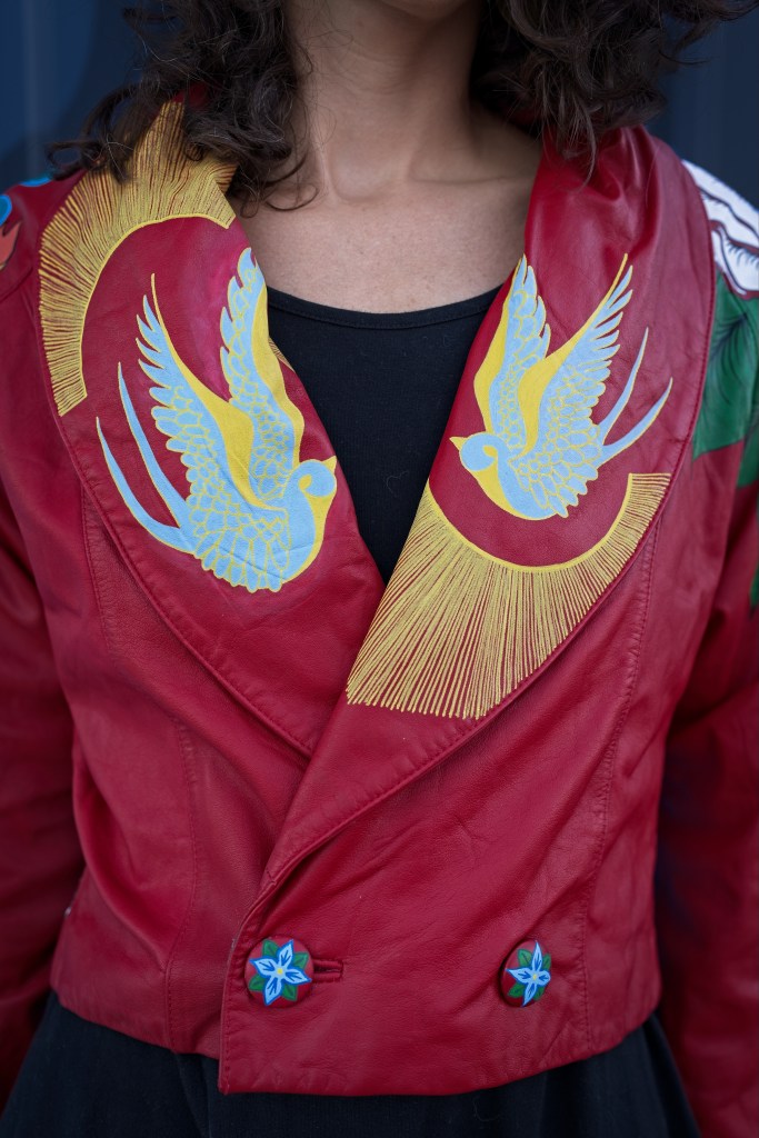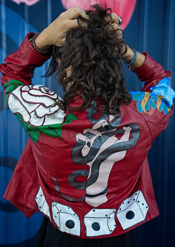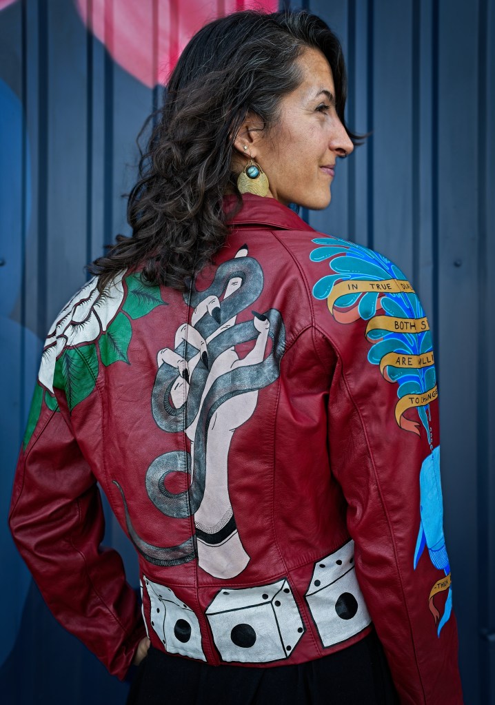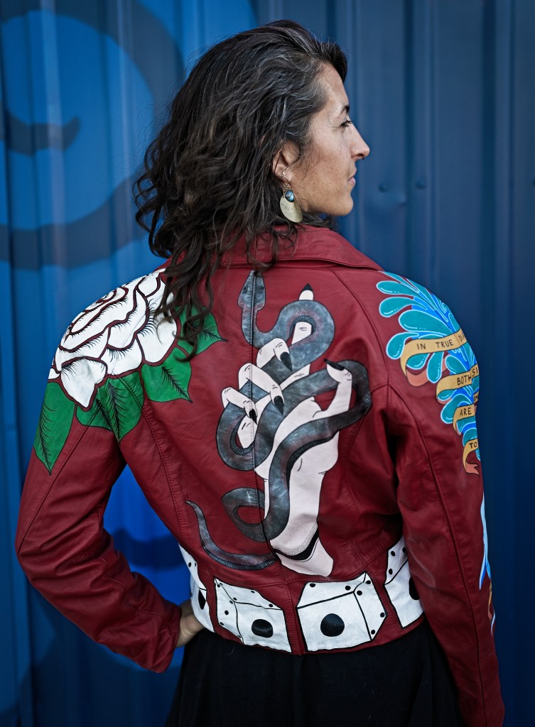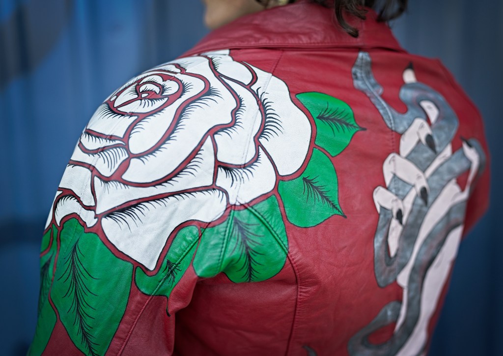In the late 1800s, tattoo artists would hang up their designs in front of their booths to catch people’s attention, and the term “flash” referred to this artwork. Things like anchors, dice, swallows, and the forever popular “Mom”-in-a-heart tattoo are traditional types of flash. With this piece, I wanted to give my own twist on traditional flash tattoos using bold colors and high contrasts against the red leather.