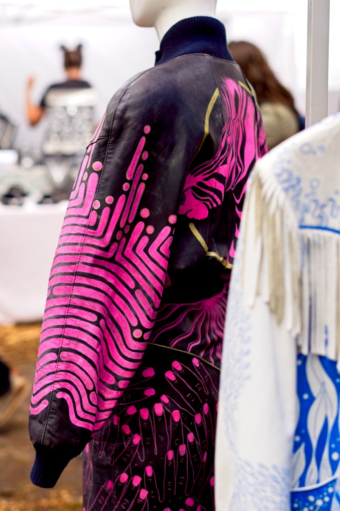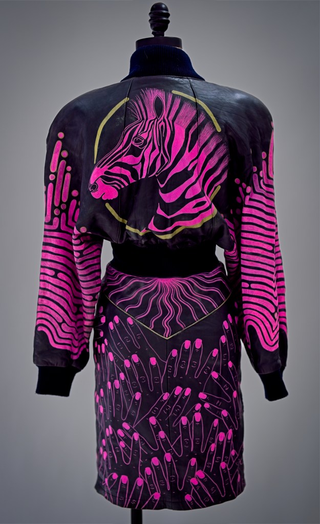 UV reactive hot pink paired with metallic gold paint create a head-turning brilliance against the black leather. A zebra head on the back of the dress is framed by thick repeating linework that extends down the sleeves and onto the front side. The hand “prints” represent the my hands, and only one handprint is “signed” with the addition of a finger tattoo.