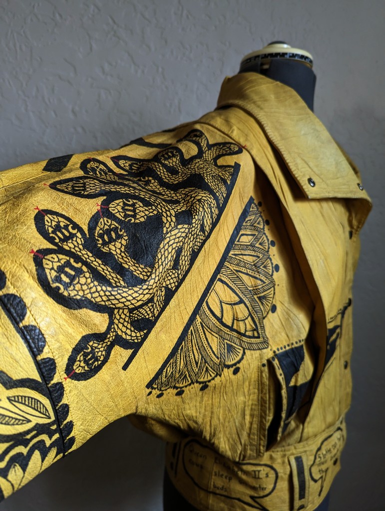 Backside of jacket adorned with abstract drawing meant to resemble overlapping Scotch tape. A hidden hand “print” lies under the collar, representing my signature.